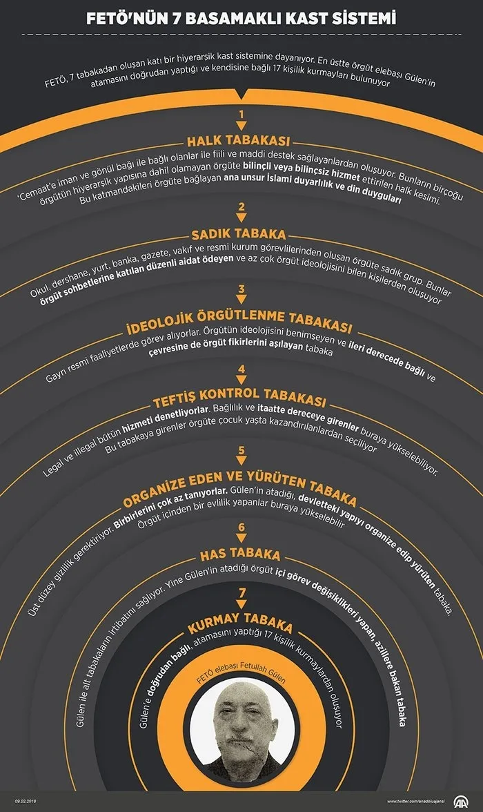 Fetullahçı Terör Örgütü (FETÖ) 7 tabakadan oluşan katı bir hiyerarşik kast sistemine dayanırken en üstte yer alan 7. tabakada, örgüt elebaşı Fetullah Gülen'in atamasını doğrudan yaptığı ve kendisine bağlı olan 17 kişilik kurmayları bulunuyor.