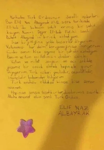 Fırat Kalkanı Harekatı sırasında şehit düşen Binbaşı Bülent Albayrak'ın kızı Elif Naz Albayrak'ın Afrin'e düzenlenen operasyona katılan askerlere destek olmak amacıyla yazdığı mektup herkesi duygulandırdı.