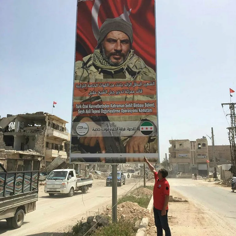 (?EL BAB'IN ALINMASINDA EN KRİTİK NOKTA OLAN AKİL DAĞI DESTANINI YAZAN BİNBASI BÜLENT ALBAYRAK, ORADA SEHİT DÜŞMÜŞTÜ. EL BAB HALKI İSE 'EL BAB FATİHİ' OLARAK GÖRDÜKLERİ BİNBAŞININ ANISINA KENTİN DÖRT BİR YANINA POSTERLERİNİ ASMIŞTI)