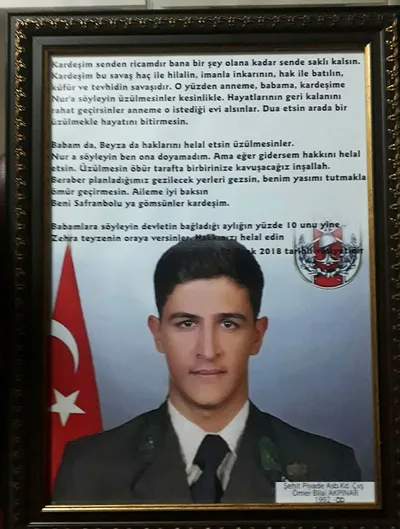 Son dakika haberi... TÜRK Silahlı Kuvvetleri'nin (TSK) Suriye'nin Afrin'de sürdürdüğü 'Zeytin Dalı Harekatı'nın 19'uncu gününde şehit olan, cenazesi geçen parşembe günü Karabük'te toprağa verilen 22 yaşındaki Piyade Astsubay Kıdemli Çavuş Ömer Bilal Akpınar'ın vasiyeti ortaya çıktı.