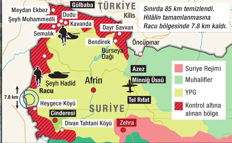 Türk Silahlı Kuvvetleri'nin başlattığı Zeytin Dalı Harekatı'nda yer alan ÖSO birlikleri ile Türkiye'nin Kilis sınırında son olarak 9 köy teröristlerden temizlendi. Suriye'nin Azez bölgesinden Şeyh Horoz, Bülbül Şenkal bölgelerinde hızla ilerleyen ÖSO birlikleri Kavanda, Dudu, Velikli, Semalık, Bendirek, Meydan Ekbez ve Şeyh Muhammedli köylerini de alarak Bülbül bölgesi ile Raco bölgesini birleştirmiş oldu ve böylelikle Türkiye'nin Afrin sınırlarında 'Hilal' oluştu.