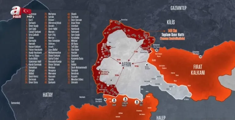 TSK ve operasyonlara destek veren ÖSO güçleri, harekatın başından bu yana YPG/PKK-DEAŞ'ın işgalindeki Afrin'de biri belde merkezi, 87'si köy, 6'sı köy altı yerleşim ve 20'si stratejik dağ veya tepe, biri YPG/PKK'ya ait üs olmak üzere 115 noktayı ele geçirdi.