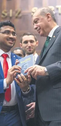 Türkiye Bursları programı ile geldiği Türkiye'de Gazi Üniversitesi'nde eğitim gören Hafijur Rahman Bengalce yazdığı "Erdoğan: Değişim Ustası" kitabını dün AK Parti Grup toplantısında Cumhurbaşkanı'na hediye etti. Erdoğan, Rahman'dan kitabın Türkçe, Arapça ve İngilizce basılmasını istedi. Cumhurbaşkanına kitabını takdim ettiği günün en mutlu günü olduğunu ifade eden Rahman, Erdoğan'a "Siz mazlumların sesi, Müslümanların liderisiniz. Sevgi ve muhabbetimiz karşılıklı" diyerek duygularını dile getirdi. Kitabının ilk iki baskısının ülkesinde 10 günde tükendiğini söyleyen Rahman"Erdoğan İslam dünyasının tek umudu ve tam bir değişim ustası. Onun konuşmaları beni yüreğimden vurdu. Bangladeş'te yüzbinler, Erdoğan'ı tanımak istiyor. Dünyaya Erdoğan'ın daha doğru anlatılması için kitabı Londra'da İngilizce olarak basmaya çalışıyoruz. 15 Temmuz'da da milyonlarca Bangladeşli Türkiye için dua etti. 15 Temmuz ve Afrin'i anlatan kitaplar da yazacağım." dedi.