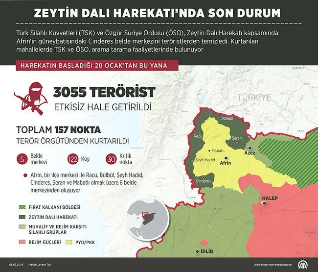 TSK ve operasyonlara destek veren ÖSO güçleri, harekatın başından bu yana YPG/PKK-DEAŞ'ın işgalindeki Afrin'de 5'i belde merkezi, 122'si köy, 30'u kritik nokta olmak üzere toplam 157 bölgeyi kontrol altına aldı.