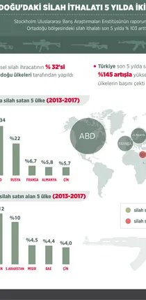 İsveç'teki Stockholm Uluslararası Barış Araştırmaları Enstitüsünün (SIPRI) küresel silah transferleri raporuna göre, Ortadoğu bölgesindeki silah ithalatı 2013- 2017 arasında, 2008-2013 yıllarına göre yüzde 103 arttı. Söz konusu dönemde küresel silah ihracatının yüzde 32'si bölge ülkeleri tarafından gerçekleştirildi. Suudi Arabistan, önceki 5 yıla göre yüzde 225 artan silah alımlarıyla dünyanın en fazla silah ihraç eden ikinci ülkesi oldu. Bir diğer bölge ülkesi Mısır, ihracatındaki yüzde 215 artışla dünya sıralamasında üçüncü sırada yer alırken, Birleşik Arap Emirlikleri (BAE) dördüncü oldu. Türkiye yerli ve milli üretimiyle ve %145'lik bir artışla yükselişteki ihracatçı ülkelerin başında yer aldı.