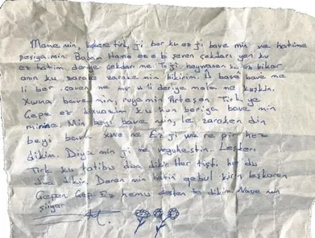 Kürtçe olarak yazdığı mektubun altına çiçek resmi çizen küçük kız, mektubunda ailesinin teröristlerin zulmüne uğradığını, tarladaki hasatlarının, ahırdaki hayvanlarının zorla alıkonulduğunu anlatıyor. Teröristlerin son geldiğinde ise gözlerinin önünde babasını öldürdüğünü yazıyor. SABAH'ın ulaştığı o yürek dağlayan mektupta yazanlar şöyle: