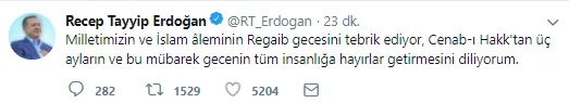 "Milletimizin ve İslam aleminin Regaip gecesini tebrik ediyor, Cenabıhak'tan üç ayların ve bu mübarek gecenin tüm insanlığa hayırlar getirmesini diliyorum."