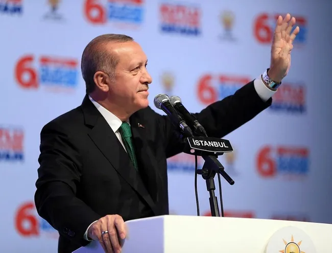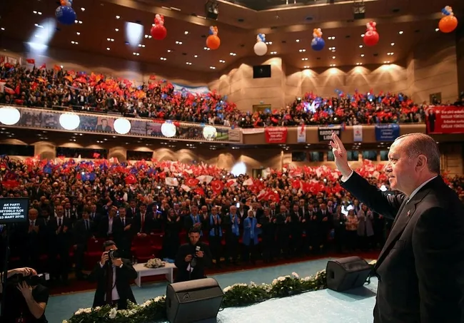 Ana kademe, kadın kolları ve gençlik kollarından seçimler için yoğun şekilde çalışmalarını isteyen Cumhurbaşkanı Erdoğan, "Beyoğlu 16 Nisan halk oylamasında yüzde 50'lik 'Evet' oranıyla İstanbul ortalamasının eh, eş seviyede kaldıysa da ben buradan tabii çok daha iyi bir netice bekliyordum. Evimiz. Evimizden tabii ki daha fazla oyun gelmesi gerekirdi, bu gelmedi. Ama şimdi diyorum ki hedef inşallah Mart 2019. 2019'da Beyoğlu sandıkları patlatmaya hazır mı? Şimdiden kolları sıvamak gerekiyor." dedi.