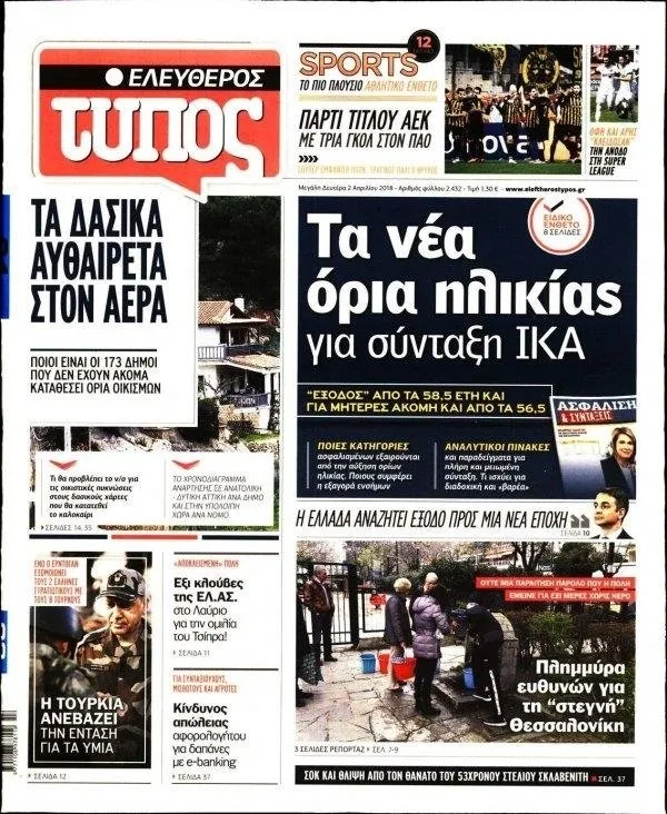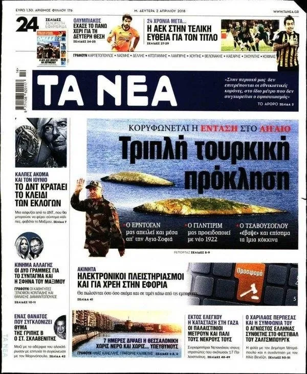 "Türkiye, Yunanistan'ı 3 koldan tahrik ediyor" manşetiyle çıkan Ta Nea Gazetesi, Cumhurbaşkanı Erdoğan'ın kamuflajlı fotoğrafını kullandığı haberde; Ayasofya'da Kur'an-ı Kerim okunması, Kardak'ta yaşananlar ve Başbakan Yıldırım'ın "Ege'de korsan hayatlar kurmak isteyenler 1922'yi hatırlasın" sözlerini tahrik nedeni olarak gösterdi..