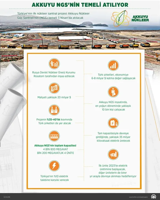 Rusya Devlet Nükleer Enerji Kurumu Rosatom tarafından inşa edilecek Akkuyu NGS bin 200 megavatlık 4 üniteden oluşacak.
