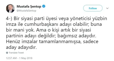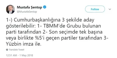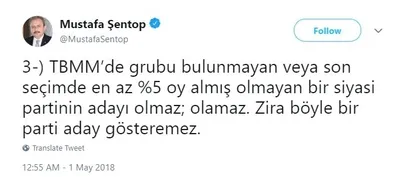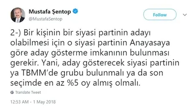 "Saadet Partisi adayını açıkladı" şeklindeki haberlere AK Parti Milletvekili ve Anayasa Komisyonu Başkanı Prof. Mustafa Şentop'tan bir itiraz geldi. Saadet Partisi'nin aday gösterebilmesi için mecliste grubu bulunması ya da son seçimlerde %5 oy alması gerektiğinin altını çizen Şentop, Twitter üzerinden yaptığı açıklamada şunları söyledi: