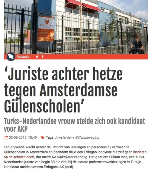Volkskrant adlı gazetenin 3 Temmuz 2016 tarihinde yayınlanan "Gülen okullarının boşaltılmasının arkasındaki sebep işte bu avukat" başlıklı haberde; "Hollanda'da Gülen okulların boşaltılmasına sebebiyet veren Ankara'nın uzun kolunun neden olduğu görülmektedir. Buna sebep olan şahıs Erdoğan'ın güvendiği avukat Şükran İnce, Gülen okullarına yönelik karalama kampanyası yürüterek ailelerin okuldan gitmesi için baskı oluşturdu" ifadeleri kullanıldı.
