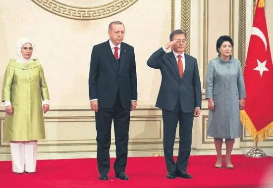 Yağış nedeniyle içeride yapılan karşılama töreninde, Devlet Başkanı Moon, Türk Milli Marşı'nı asker selamı vererek dinledi.