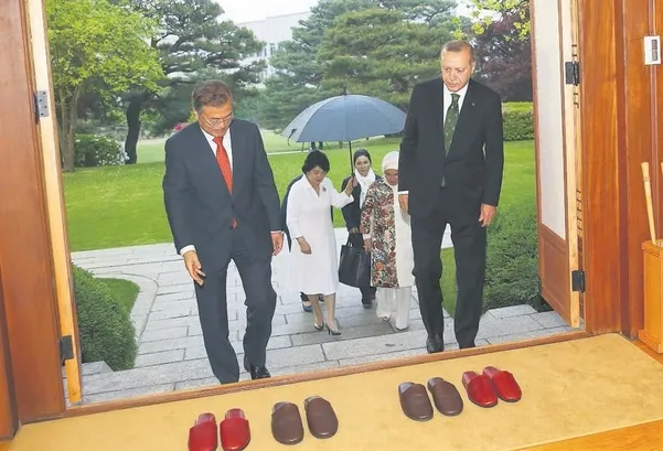 Güney Kore Devlet Başkanı Moon Jae-in ve eşi Kim Jungsook, akşam yemeği öncesinde Cumhurbaşkanı Recep Tayyip Erdoğan ve eşi Emine Erdoğan'a Seul'deki Kore Evi'nde çay ikram etti. Erdoğan ve Moon çiftleri bir süre yağmur altında bahçede yürüyüş yaptı. Kore Evi'nin girişinde ayakkabılarını çıkartarak terlik giyen iki lider ve eşleri, burada çay içerek sohbet etti. Güney Kore Devlet Başkanı Moon ve eşi, daha sonra Erdoğan çifti onuruna Mavi Saray'da akşam yemeği verdi.