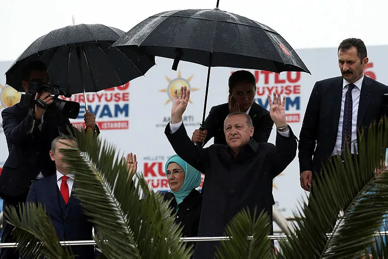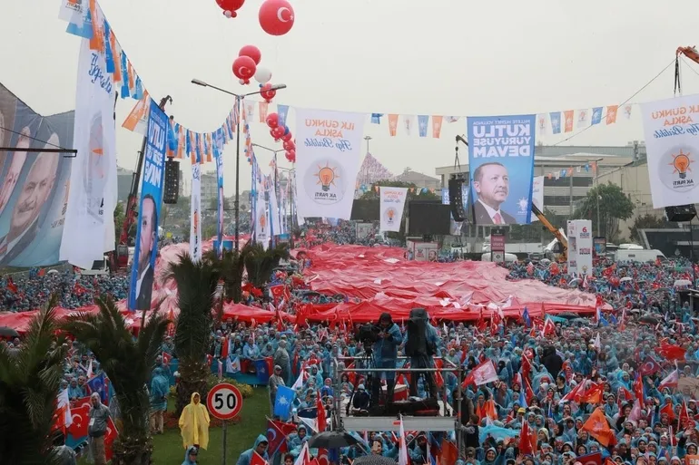 Cumhurbaşkanı Erdoğan, salon dışında bekleyen vatandaşlara seslendi. Yağmurdan etkilenmemeleri için naylon yağmurlukların dağıtıldığı vatandaşlar, Türk bayraklarıyla Erdoğan'a sevgi gösterisinde bulundu.