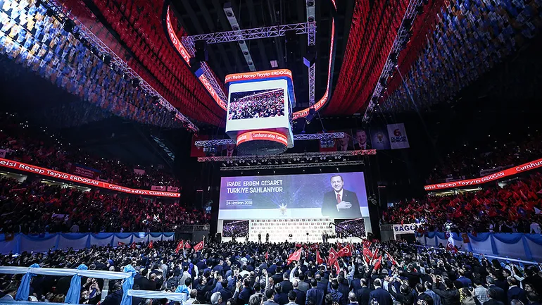 AK Parti'nin 24 Haziran seçimlerinde kullanacağı slogan "İrade, erdem, cesaret... Türkiye şahlanıyor" olarak açıklandı. Erdoğan'ın konuşması boyunca bu slogan arkasındaki ekrana yansıtıldı.