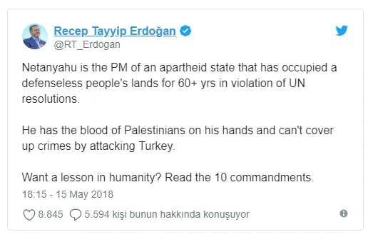Cumhurbaşkanı Recep Tayyip Erdoğan, "(İsrail Başbakanı Binyamin) Netanyahu'nun elinde Filistinlilerin kanı vardır ve suçlarını Türkiye'ye saldırarak saklayamaz." açıklamasında bulundu.