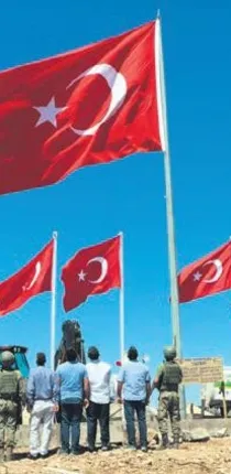 Afrin’de Racu bölgesinde 9 kahraman askerin şehit düştüğü Keltepe’ye dev ay yıldızlı bayrak dikildi. Şehitler Tepesi’nde 9 şehidin anısına 9 bayrak dalgalanacak