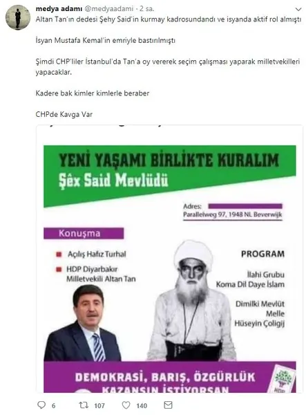 Dedesi Şeyh Said isyanında aktif rol oynayan Altan Tan'ın, CHP'den milletvekili adayı gösterilmesi gündeme geldi. Altan Tan'ın adaylığı için sosyal medyada "Kimler kimlerle beraber" yorumları yapıldı