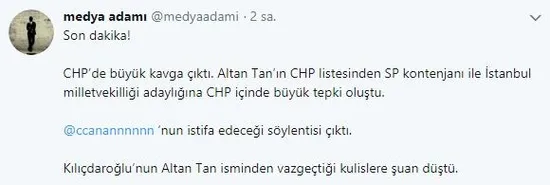 Parti içinde yaşanan krizin ardından CHP Genel Başkanı Kemal Kılıçdaroğlu, Altan Tan'ın isminden son anda vazgeçmek zorunda kaldı.