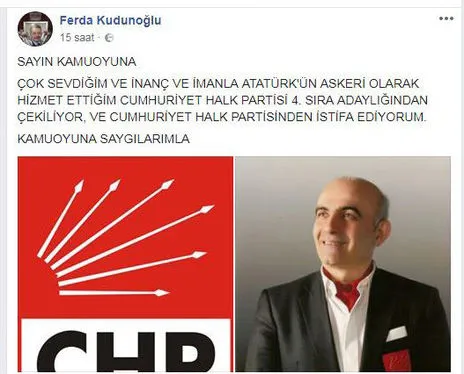 Kudunoğlu, yaptığı yazılı açıklamada, "Kamuoyuna, çok sevdiğim ve inanç ve imanla Atatürk'ün askeri olarak hizmet ettiğim Cumhuriyet Halk Partisi 4'üncü sıra adaylığından çekiliyor ve partimden istifa ediyorum" ifadelerine yer verdi.