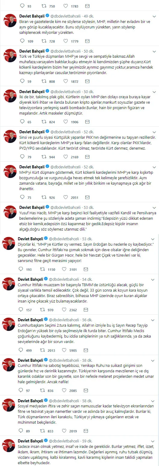 MHP Genel Başkanı Devlet Bahçeli, milletvekili aday listelerinin açıklanmasından sonra Twitter hesabı üzerinden açıklamalarda bulundu. Bahçeli, "Diyorlar ki 'MHP'ye Kürtler oy vermez. Sayın Erdoğan bu nedenle oy kaybediyor.' Bu çevreler, Cumhur İttifakı'na çomak sokmak için deve olsalar iğne deliğinden geçecekler. Hele bir Gürgan Hacır, hele bir Nevzat Çiçek ve türevleri var ki, sanırsınız fitne geçit merasimi yapıyor" dedi.