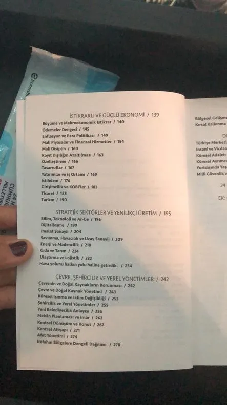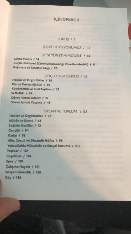 360 sayfadan oluşan beyannamede 16 başlık bulunuyor. İlk bölümde yeni yönetim modeli anlatılırken; güçlü Meclis, güçlü hükümet, güçlü millet vurgusu var. Sunuş kısmında Cumhurbaşkanı Erdoğan'ın açıklaması var. 'Yaparsa yine AK Parti yapar' mesajı bulunuyor. Beyannamede güçlü demokrasi, istikrarlı ve güçlü ekonomi vurgusu öne çıkıyor. Yeni çevre projeleri de beyannamede yer alıyor.