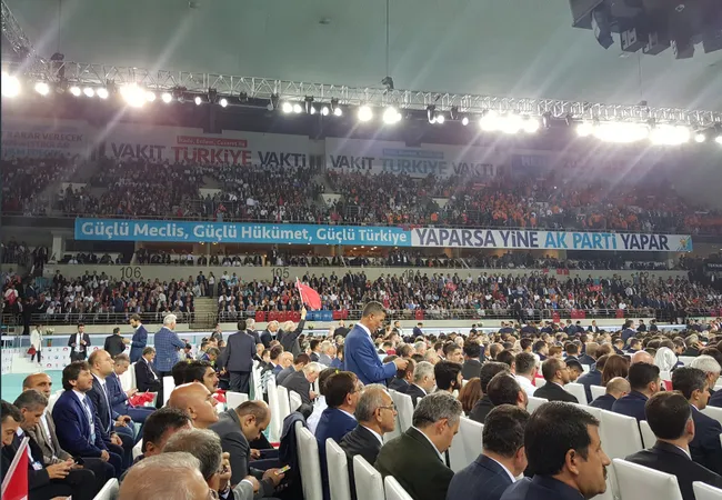 Ankara Spor Salonu'nu dolduran partililer, Cumhurbaşkanı Erdoğan'ı ellerindeki Türk bayraklarını ve AK Parti flamalarını sallayıp cep telefonlarının ışıklarını yakarak karşıladı.