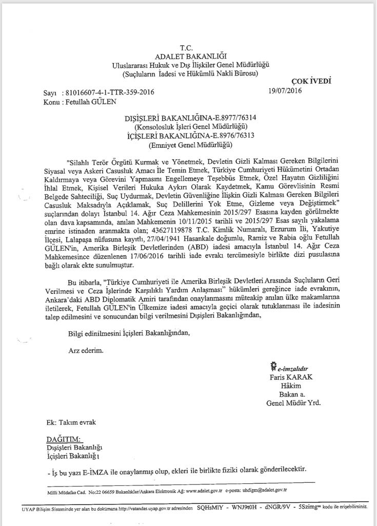 Adalet Bakanlığının belgelerine göre Fetullah Gülen'in 15 Temmuz 2016 tarihindeki darbenin hemen ardından 19 Temmuz 2016 tarihinde istenmesine ilişkin yazının yazıldığı ortaya çıktı.