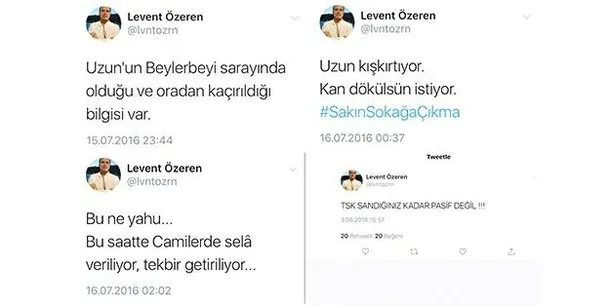 Özeren'in sosyal medya hesabından yaptığı paylaşımlarda Cumhurbaşkanı Erdoğan'ın halkı FETÖ'nün darbe girişimine karşı meydanlara çağırmasından rahatsız olduğu anlaşılıyor.