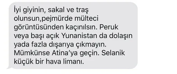Gönderilen mesajda "İyi giyinin, sakal tıraşı olun, mülteci görüntüsünden kaçının. Peruklu veya başı açık Yunanistan'da dolaşın ya da fazla dışarı çıkmayın. Mümkünse Atina'ya geçin. Selanik küçük bir havalimanı" talimatı yer aldı.