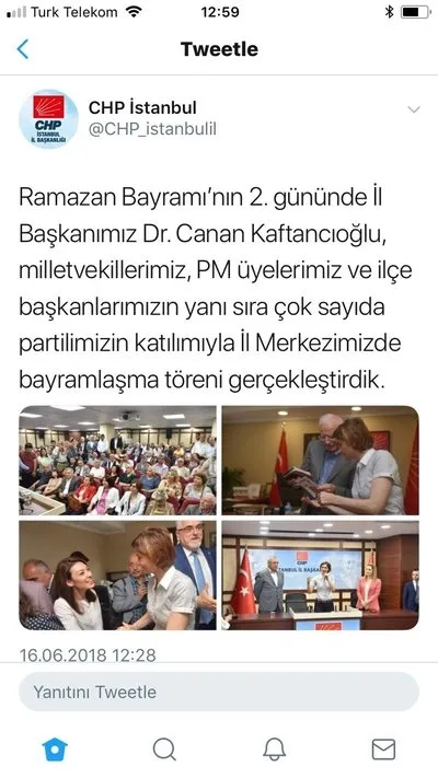 CHP'nin İstanbul 36. Olağan İl Kongresi'nde il başkanlığına seçilen Canan Kaftancıoğlu'nun birbirinden farklı pek çok konuda skandal paylaşımlar yaptığı ortaya çıkmıştı. Gezi ve Kobani provokasyonlarına destek veren Kaftancıoğlu, ramazan ayı ve ezanla ilgili hakaret içeren tweetler de atmıştı. Kaftancıoğlu'nun 24 Haziran seçimleri öncesi muhafazakar oylara oynamak için Ramazan Bayramı bayramlaşma törenine katılması ise Kaftancıoğlu'nun ve CHP'nin iki yüzlülüğünü tekrar gözler önüne serdi...