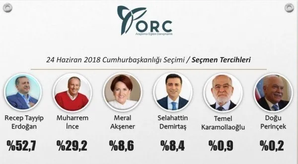 ORC AraştIrma'nın 17-19 Haziran arasında 36 ilde toplam 4250 kişi ile yüz yüze yapılan çalışmasında çarpıcı sonuçlar ortaya çıktı. Buna göre Cumhurbaşkanı Recep Tayyip Erdoğan yüzde 52,7 ile birinci turda seçimden galip çıkan isim olacak.