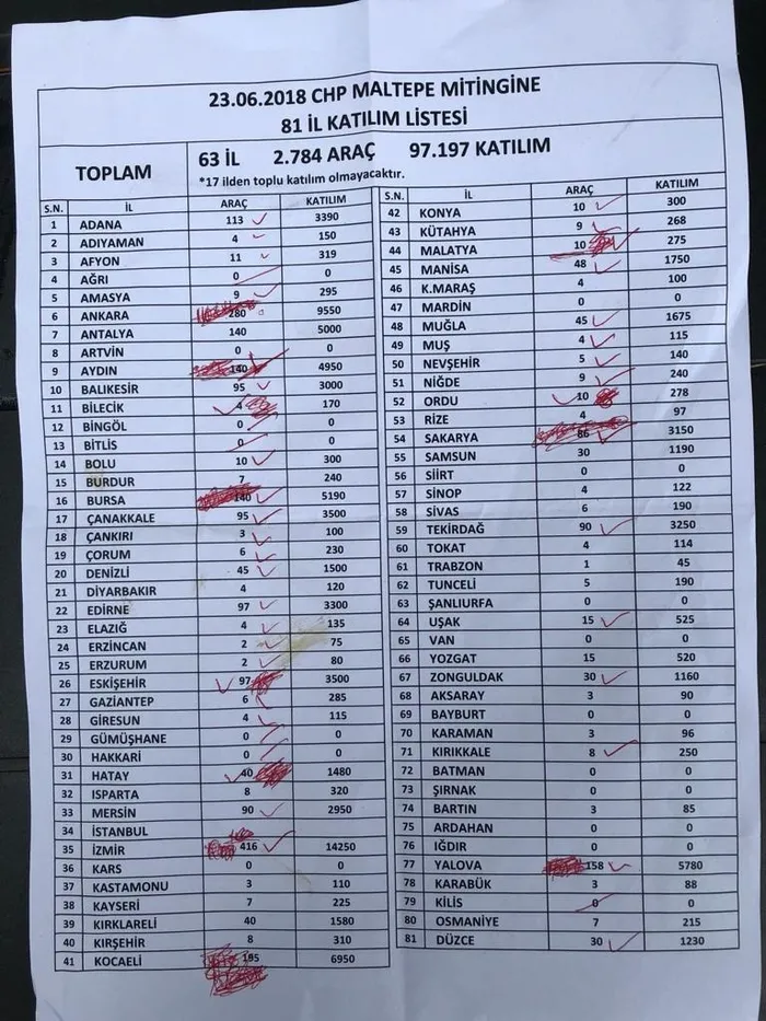 Seçim öncesi son mitingini Maltepe'de yapan CHP alanı kalabalık göstermek için çevre illerden otobüslerle adam taşıdı. Maltepe mitingine İstanbul'dan 5 milyona yakın vatandaşın katıldığı iddiaları sosyal medyada yer alıyor. Fakat sosyal medyadan paylaşılan bir fotoğrafta bu sayının gerçeği yansıtmadığı ve CHP'nin 63 ilden toplam 2784 araçla 97.197 kişiyi Maltepe miting alanına getirdiği ortaya çıktı.
