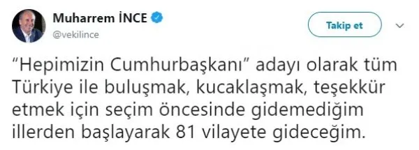 Son dakika haberi! Partisinin 24 Haziran'da aldığı hezimetten sonra ilk defa kameralar karşısına çıkan CHP Genel Başkanı Kemal Kılıçdaroğlu'nun konuşmasının ardından, CHP'nin Cumhurbaşkanı Adayı Muharrem İnce resmi Twitter hesabından; "Türkiye ile buluşmak, kucaklaşmak, teşekkür etmek için seçim öncesinde gidemediğim illerden başlayarak, 81 vilayete gideceğim." ifadesini kullandı. İnce'nin bu tweeti parti içi mücadele başlıyor yorumlarına neden oldu