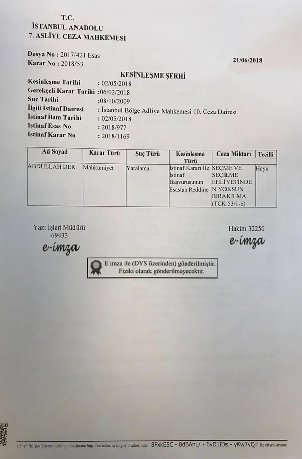 Türk Ceza Kanunu'nun 53. Maddesinin 'b' fıkrası gereği seçme ve seçilme hakkını kaybeden Abdullah Der'in belediye meclis üyeliğinin düştüğü belirtldi. Abdullah Der'in, belediye meclis üyeliğinin düştüğü için belediye başkan yardımcılığı görevine de devam edemeyeceği kaydedildi. Mahkemenin, Der'in seçme seçilme hakkını kaybettiğine dair yazıyı, ilçe seçim kurulu ve Ataşehir Belediyesi'ne gönderdiği de kaydedildi.