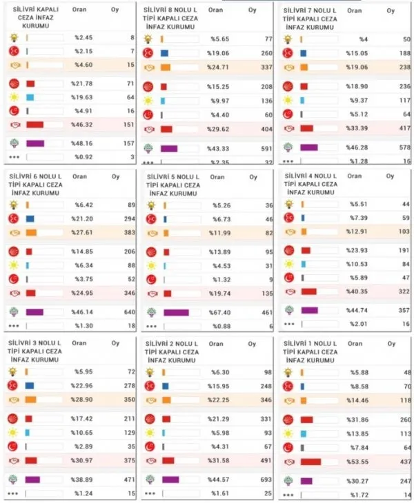 Silivri 8 Nolu L Tipi Kapalı Ceza İnfaz Kurumu'nda da benzer sonuçlar ortaya çıktı. Yüzde 43.33 ile HDP'nin ilk sırada yer aldığı sandıklardan CHP'ye yüzde 15.25, İyi Parti'ye ise yüzde 9.97 oranında oy çıktı.