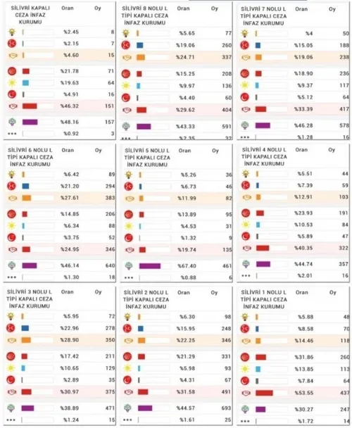 Silivri 8 Nolu L Tipi Kapalı Ceza İnfaz Kurumu'nda da benzer sonuçlar ortaya çıktı. Yüzde 43.33 ile HDP'nin ilk sırada yer aldığı sandıklardan CHP'ye yüzde 15.25, İyi Parti'ye ise yüzde 9.97 oranında oy çıktı.