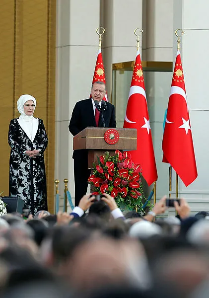 Yeni hükümet sisteminin ilk cumhurbaşkanı seçilen Recep Tayyip Erdoğan'ın göreve başlaması dolayısıyla Cumhurbaşkanlığı Külliyesi'nde görkemli bir tören düzenlendi. Törende konuşan Başkan Erdoğan, "Bu defa cumhurbaşkanlığı makamına, değişen yönetim sisteminin gereği olarak yürütme organının tüm yetkileriyle birlikte geldik. Allah bizi milletimize mahcup etmesin. Rabbim milletimize ve tüm insanlığa yapacağımız hizmetlerde yolumuzu aydınlatsın, işimizi kolaylaştırsın. 40 yılı aşkın süredir siyasetin içindeyim. Efendiliğe değil, özellikle millete hizmetkar olmaya geldik. Hizmetkarlığına talip olduğumuz milletimize layık olabilmek için geceli gündüzlü çalıştık. Hamdolsun milletimiz bizi hiçbir zaman yalnız bırakmadı, yolda koymadı. 24 Haziran'da bir kez daha kendisine hizmet etmek üzere bizi seçti. Sadece bize oy verenlerin değil, 81 milyonun tamamının cumhurbaşkanı olduğumuzun bilinciyle milletimize layık olmaya çalışacağız" ifadelerini kullandı.