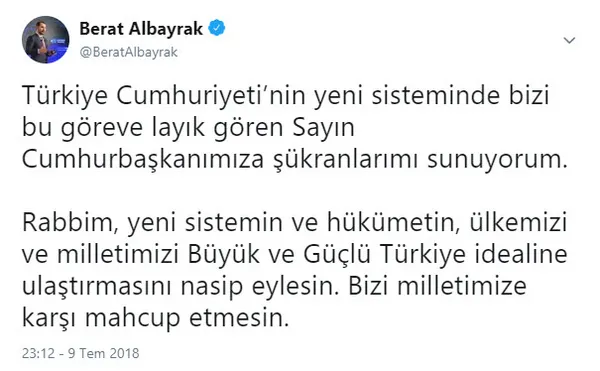 Yeni sistem sonrası ilk kabinenin listesi Başkan Recep Tayyip Erdoğan tarafından açıklandı. Hazine ve Maliye Bakanı Berat Albayrak oldu. Bakan Albayrak, yeni kabinenin Başkan Erdoğan tarafından açıklanmasının ardından Twitter hesabından bir paylaşım yaptı.