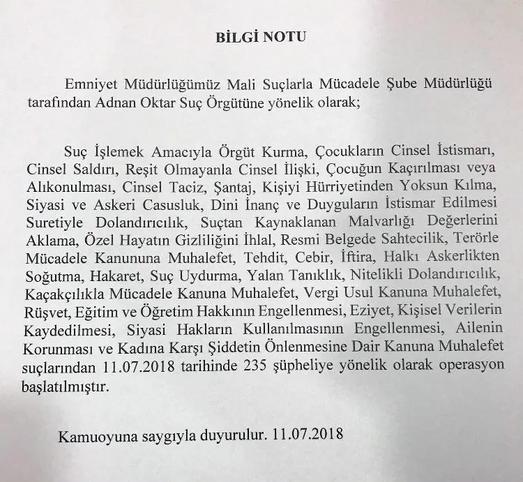 İstanbul Emniyet Müdürlüğü, Adnan Oktar Suç Örgütü'ne yönelik İstanbul merkezli 5 ilde eş zamanlı operasyon başlattı. Adnan Oktar ve 235 müridinin gözaltına alındığı operasyonda küçük yaştaki kız çocuklarına cinsel tacizden, hürriyetten yoksun bırakmaya, tehdit ve şantajdan, uluslarası ajanlığa kadar bir sayfa dolusu suçlama yeralıyor.