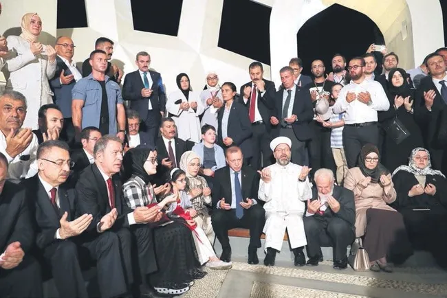 Başkan Erdoğan, Nakkaştepe'de aracından inerek yürüyüşe katıldı. Vatandaşların sevgi gösterisinde bulunduğu Erdoğan'a, eşi Emine Erdoğan ve torunları, Cumhurbaşkanı Yardımcısı Fuat Oktay, bakanlar, milletvekilleri, belediye başkanları da eşlik etti. Erdoğan ve beraberindekiler, 15 Temmuz Şehitler Makamı'na geldi. Burada Diyanet İşleri Başkanı Ali Erbaş tarafından dua edildi.