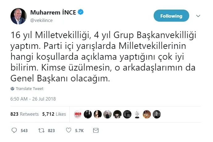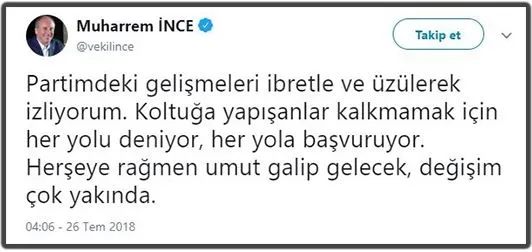 Muharrem İnce sosyal medya hesabından paylaştığı mesajda, "Koltuğa yapışanlar kalkmamak için her yolu deniyor, her yola başvuruyor. Her şeye rağmen umut galip gelecek, değişim çok yakında" açıklamasını yaptı.