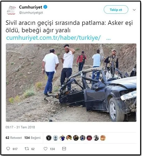 Hakkari'de dün terör örgütü PKK, 11 aylık bebekle birlikte annesini yola düzenledikleri el yapımı patlayıcı ile şehit etti. Asker eşini ziyaretten dönen anne ve bebeğini şehit eden teröristlere Cumhuriyet gazetesi ise skandal bir şekilde sahip çıktı. Gazete saldırıyı gerçekleştiren PKK'lı hainlere "terörist" diyemedi... Cumhuriyet, gerçekleşen alçak saldırıyı okuyucularına "Sivil aracın geçişi sırasında patlama" başlığı ile duyurdu. Son zamanlarda terör örgütünün yayın organı gibi haberler yapan Cumhuriyet daha önce de eli kanlı örgütün terör saldırılarında benzer bir dil kullanmıştı...