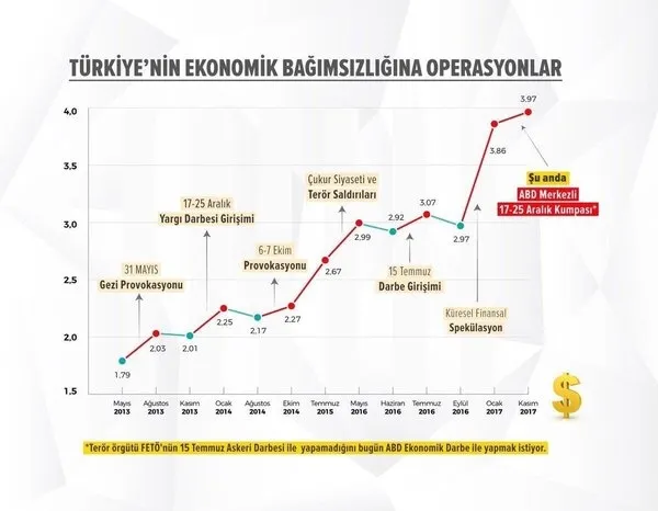ABD, Türkiye'ye siyaseten diz çöktürmek istediği her dönemde, ekonomimizi hedef aldı. Gezi öncesi 1.77 olan dolar, kalkışma sonrası 1.98'e yükseldi. 17-25 öncesi 1.98 olan dolar, hemen sonrasında 2.18'e ulaştı.