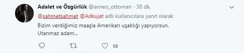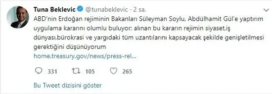 Kimliğinde Türk adı olan ancak zihnen ve ruhen ABD'ye bağlı davrananlardan biri de Tuna Bekleviç. Twitter hesabından yaptığı skandal açıklamalarla, Amerika'nın Türkiye'ye karşı savurduğu yaptırım tehditlerini alkışladı.