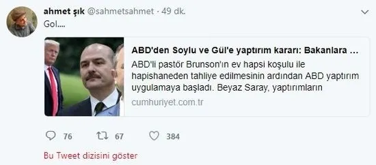 Türkiye'ye ihanet sadece ABD'den veya yurt dışına kaçmış hainlerden değil, yurt içindeki hainlerden de geliyor. Öyle ki CHP'nin katkı oylarıyla Meclis'e soktuğu HDP'nin, daha önce "devletiniz katildir" açıklamasıyla gündeme gelen skandal ismi Ahmet Şık da ihanetin bir diğer ortağı oldu. Şık, Twitter hesabından yaptığı paylaşımda Türkiye'ye yapılan yaptırım tehdidine ilişkin sevincini, "Gol..." yorumuyla paylaştı!