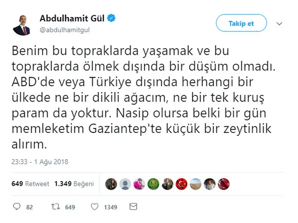 Gül, paylaşımında, "Benim bu topraklarda yaşamak ve bu topraklarda ölmek dışında bir düşüm olmadı. ABD'de veya Türkiye dışında herhangi bir ülkede ne bir dikili ağacım ne bir tek kuruş param da yoktur. Nasip olursa belki bir gün memleketim Gaziantep'te küçük bir zeytinlik alırım." ifadelerine yer verdi.