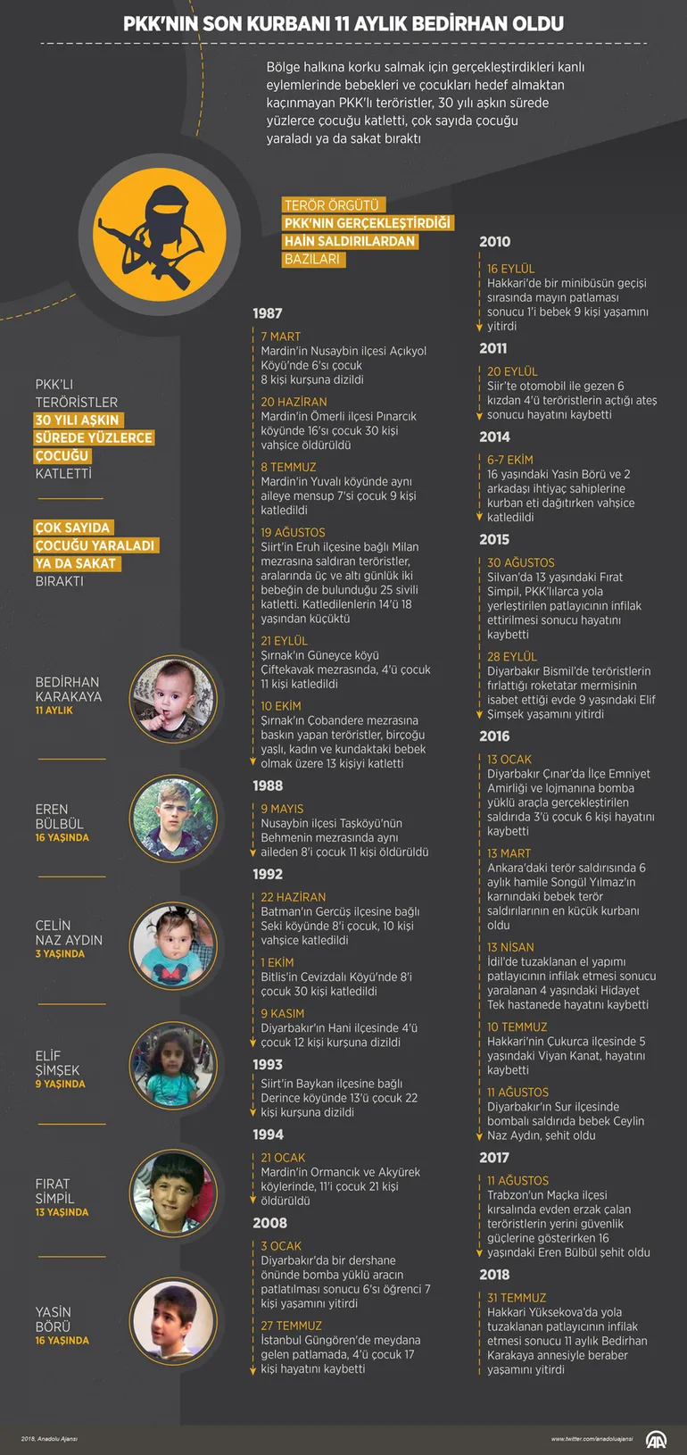 Bölge halkına korku salmak için gerçekleştirdiği kanlı eylemleriyle yüzlerce çocuğu katleden, çok sayıda çocuğu da yaralayan veya sakat bırakan terör örgütü PKK'nın son kurbanı 11 aylık Bedirhan oldu.