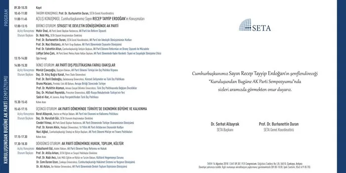 Bu panelin açılış konuşmasını Hazine ve Maliye Bakanı Berat Albayrak yapacak. Burada da ekonomistler akademisyenler AK Parti'nin kalkınma, ekonomi, finans alanlarındaki politikalarını tartışacaklar. Son panel ise hukuk, toplum, kültürle ilgili bu oturumun açılış konuşmasını Adalet Bakanı Abdulhamit Gül gerçekleştirecek. Burada Türkiye'de yargının dönüşümünden kültürel hegemonya meselesinden toplumun dönüşümünden devlet toplum siyaset ilişkisinden çeşitli başlıklar ele alınacak. 14 Ağustos'ta 'Kuruluşundan Bugüne AK Parti Sempozyumu' bir gün devam edecek ama yoğun bir program olacak" ifadelerini kullandı.